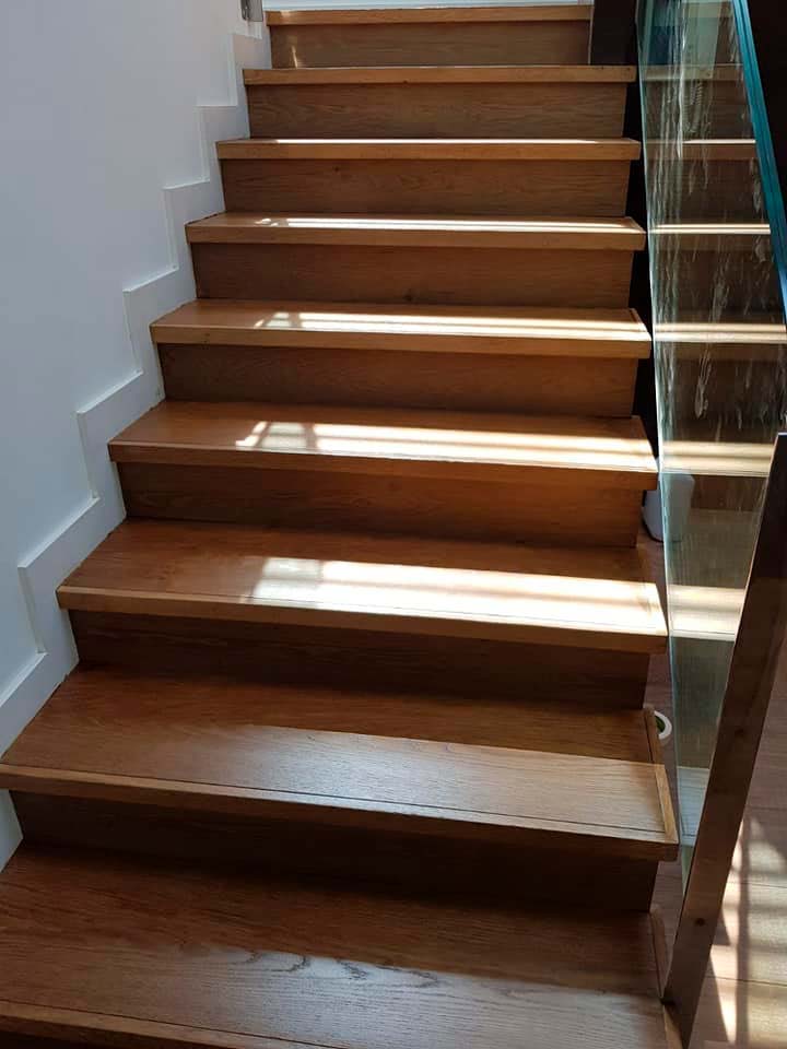 En cuanto a las escaleras de madera se pueden realizar macizas, en las cuales los peldaños y frontales son realizados en madera maciza, hechas con un revestimiento de parquet; para que queden en sintonía con el suelo o bien se puede realizar los peldaños con una estructura metálica y los peldaños en madera que encastren dentro de la estructura o recrear los peldaños flotantes.